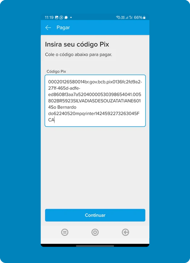 Cole o "Código PIX" e clique em "Continuar" para realizar o pagamento.