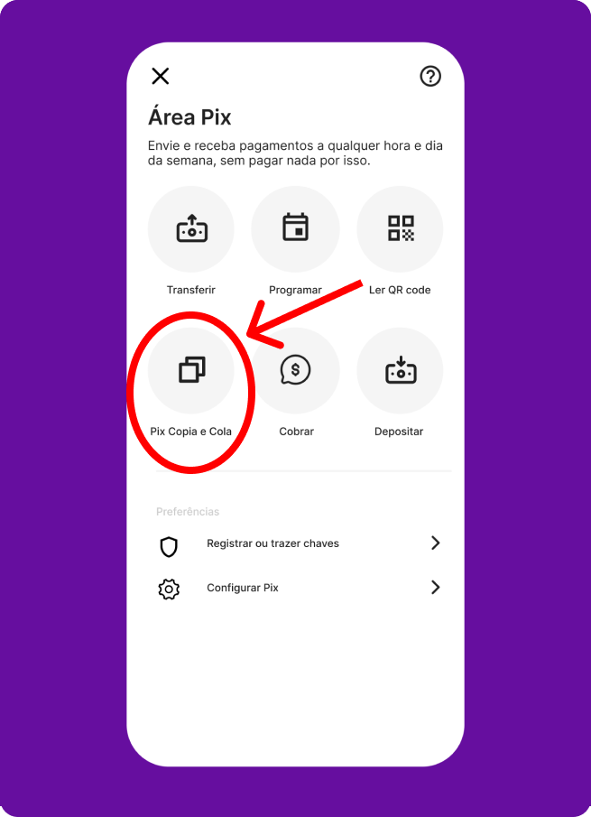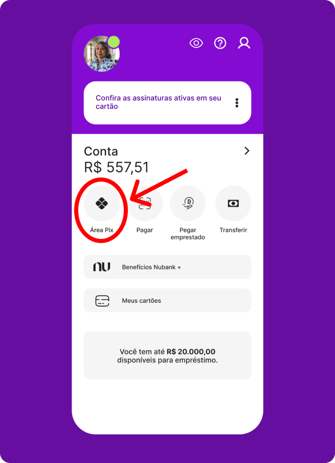 Abra seu aplicativo do Nubank e selecione a opção "Área PIX".